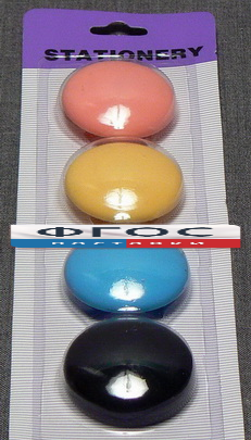 Набор представляет собой 4 магнита, лежащие внутри пластмассовых корпусов разного цвета. Их диаметр составляет 35 мм.