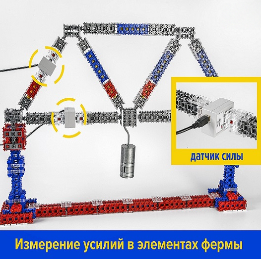 Демонстрационный набор позволяет на основе простейших моделей изучить зависимость напряжений от деформации, возникающих в элементах ферм, балок и кронштейнов.