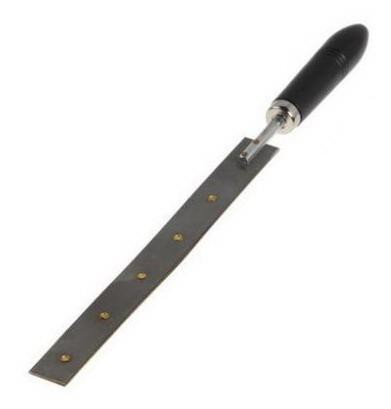 Биметаллическая пластина изготовлена из двух тонких пластин склепанных вместе. Одна из пластин стальная, вторая из латуни. К одному из торцов пластины прикреплена рукоятка. При нагревании или охлаждении биметаллическая пластина изгибается в ту или другую сторону.