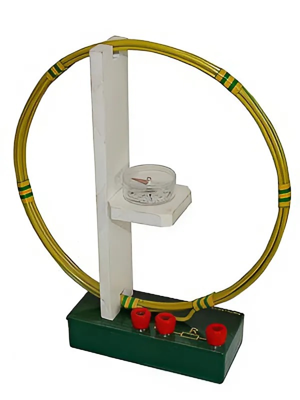 Прибор состоит из катушки диаметром 0,21 м (6 витков провода), компаса и резистора; установлен на подставке.