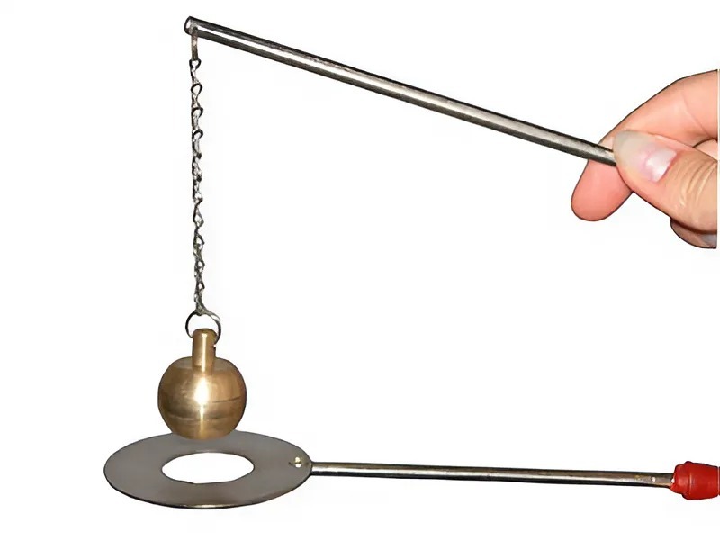 Шар и кольцо изготовлены из металла, снабжены держателями, выполненными из термоизоляционного материала. Шар свободно проходит через кольцо при их одинаковой температуре. При нагревании шара он расширяется и застревает в кольце.