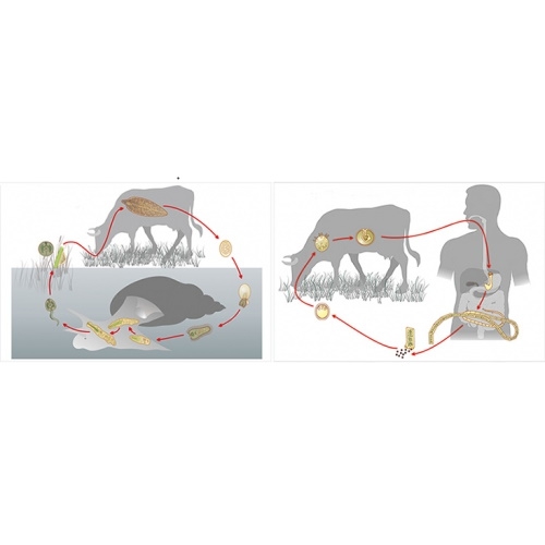 Яйца вместе с желчью попадают в кишечник коровы и с фекалиями выходят наружу. В воде из яйца выходит покрытая ресничками личинка, которая инфицирует промежуточного хозяина.