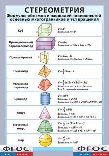 Таблица "Стереометрия. Формулы объемов и площадей поверхностей основных многогранников и тел вращения" (винил) - fgospostavki.ru - Киров