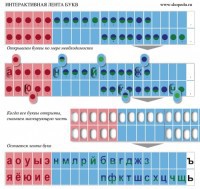 Интерактивность пособия заключается в возможности открывать, показывать буквы, по мере их изучения! Когда все буквы на «ленте» открыты, пособие помогает в обобщении изученного материала и используется как памятка, на протяжении всего первого года обучения грамоте