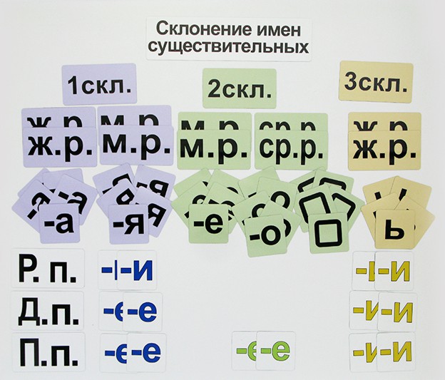 Используя данный набор магнитных карточек, можно немного поиграть на школьной доске, например, в игру, какая команда быстрее и  правильнее вставит окончания в слова  (карточек с соответствующими буквами в наборе по несколько штук). А чтобы всем было интереснее (ну, и полегче немножко), мы сделали окончания разных склонений разноцветными: 1-ое склонение у нас фиолетовое, 2-ое - зеленое, 3-е - желтое.