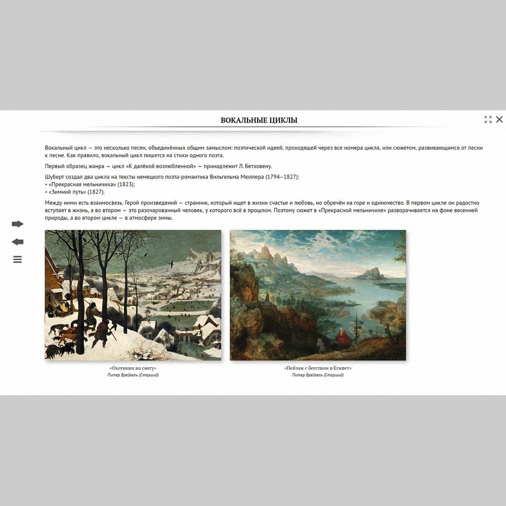 Структуру интерактивного пособия составили пять глав. Представленный в них учебный материал ориентирован на примерную программу предмета «Музыкальная литература» и учебник «Музыкальная литература зарубежных стран» О.И. Аверьяновой, Г.А. Жуковской и А.А. Петровой.