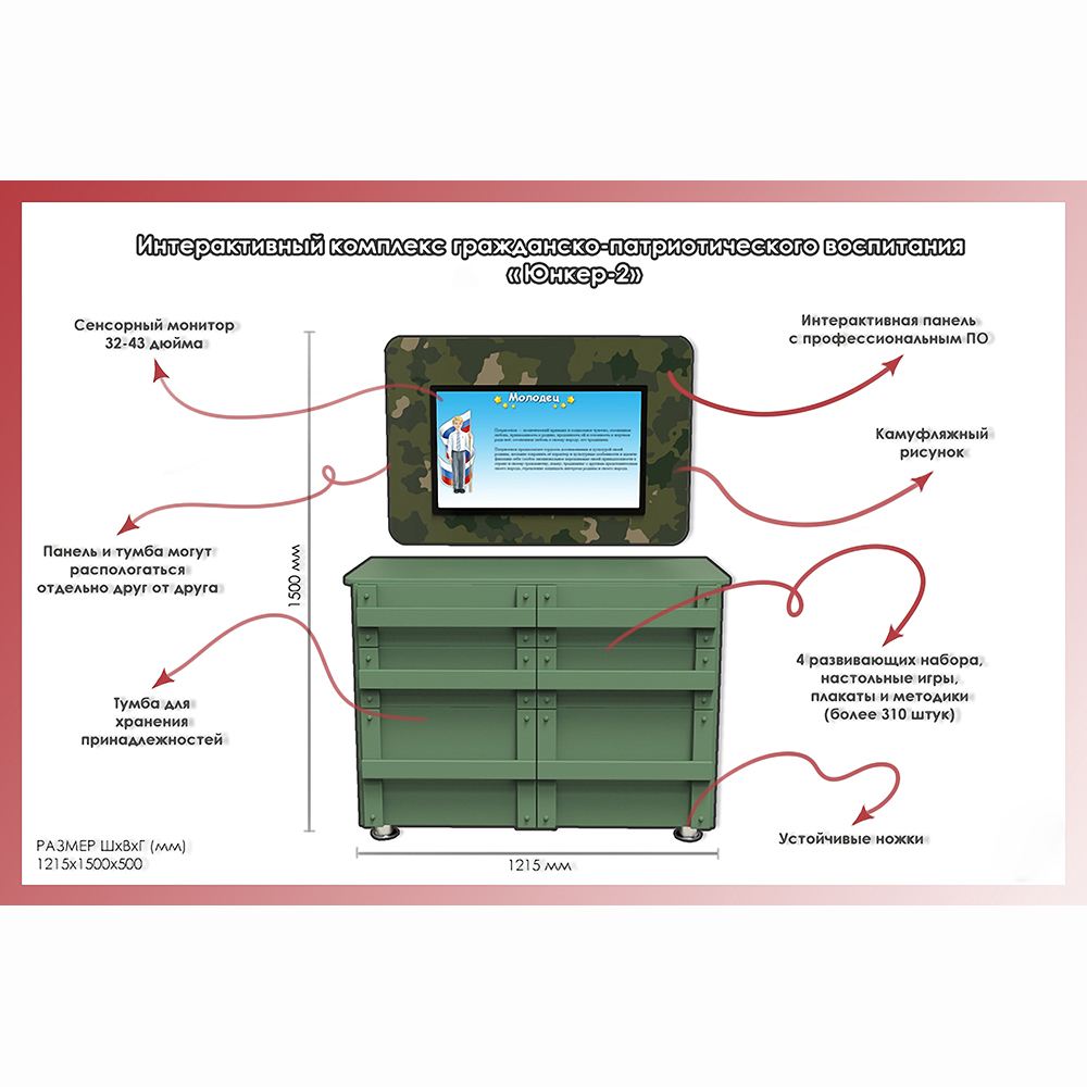Интерактивный комплекс гражданско-патриотического воспитания «Юнкер-2» - это инновационный интерактивный комплекс гражданско-патриотического воспитания. Он подходит для использования в учебных заведениях, чтобы проводить занятия по начальной военной подготовке и патриотическому воспитанию.