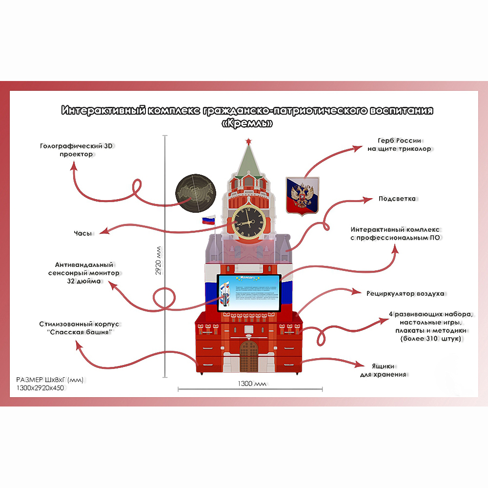 Комплекс ГПВ «Кремль» состоит из двух основных элементов: стилизованного корпуса и вмонтированной интерактивной системы, на базе производительного компьютера с большим сенсорным дисплеем, распознающим до 10 одновременных касаний. Такие характеристики позволяют проводить развивающие индивидуальные и групповые занятия с полным вовлечением участвующего ребенка.