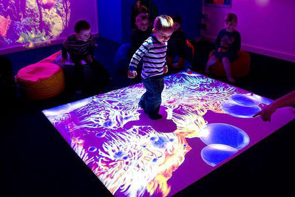 Интерактивный пол – это напольная проекция, реагирующая на движения. С ним, пол в детской комнате превращается, либо в поверхность океана, в которой плавают рыбки, либо в огромное футбольное поле, на котором можно поиграть с мячом, либо в летний луг с бабочками..., при этом, изображение моментально реагирует на движение детей.
