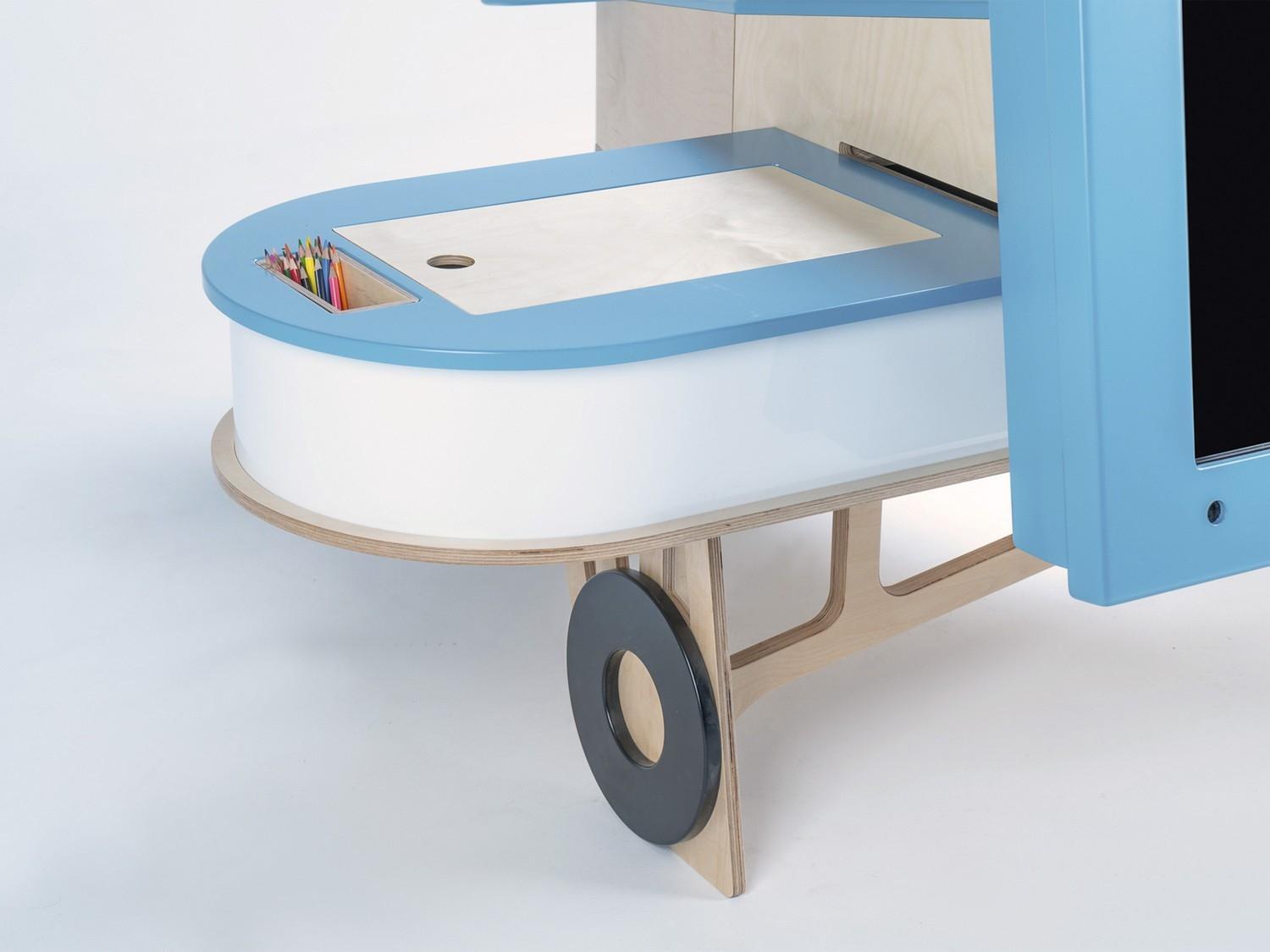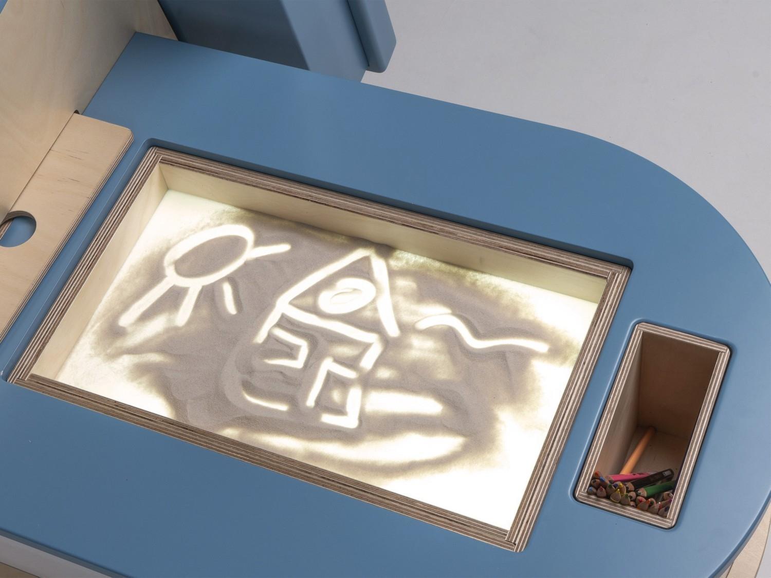 На правом крыле самолёта расположен световой стол для рисования песком. Песочная панель закрывается крышкой, становясь полноценной рабочей зоной для детей.