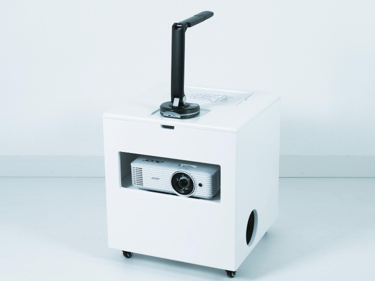 Благодаря подвижной платформе и компактным размерам оборудование легко перемещать между помещениями, а яркий проектор позволяет выводить изображение на различные поверхности.