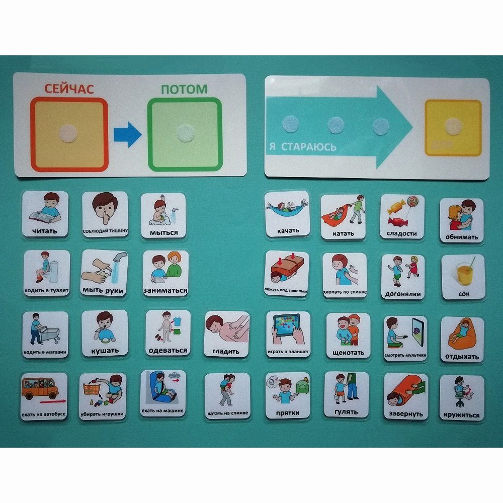 течение дня, либо во время какого-то одного занятия или события. Один из вариантов - это планшетка с картинками или словами, обозначающими действия. Они расположены в порядке выполнения.