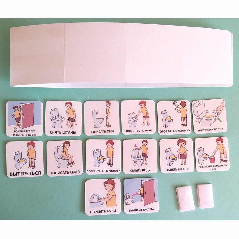 Самостоятельность в туалете - очень важный навык. Визуальная последовательность поможет как на ранних этапах обучения - пояснит какие действия нужно выполнять. И может остаться в качестве подсказки тогда, когда навык будет освоен.