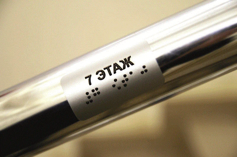Наклейка на поручень (Брайль) используется в качестве тактильного указателя, которая позволяет человеку с ограничением зрения понять, на каком этаже в данный момент он находится.