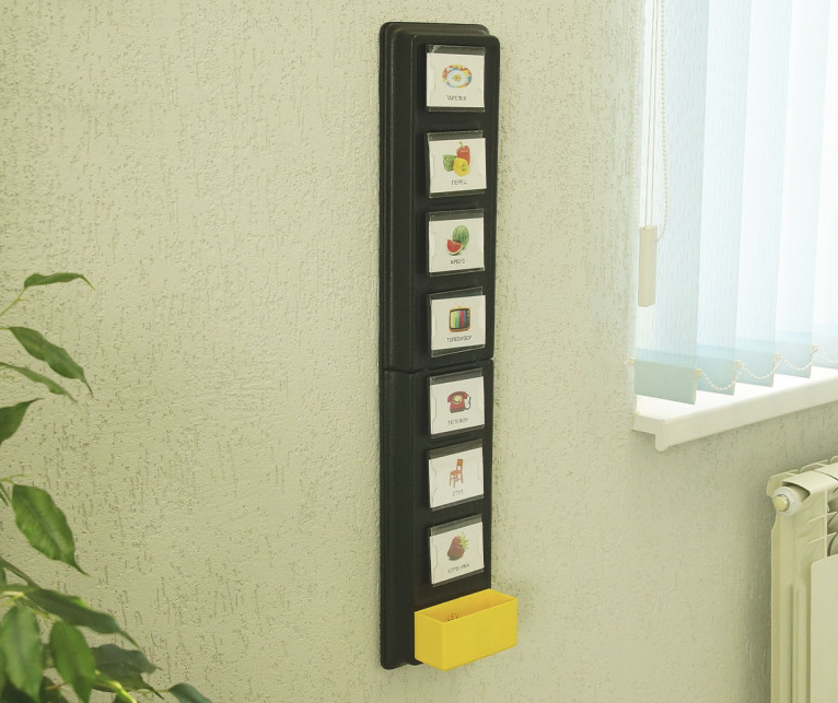 Обучающий семикнопочный настенный игровой коммуникатор со съемными символами, это программируемое устройство предназначенное для записи и воспроизведения голосовых сообщений. Устройство имеет вертикальную конструктивную плоскость с 7 кнопками-карманами, которые в свою очередь могут отстегиваться (кнопки крепятся к поверхности на липучке). В карманы можно вставлять различные тематические карточки, и нажимая на них записывать/воспроизводить голосовые сообщения.