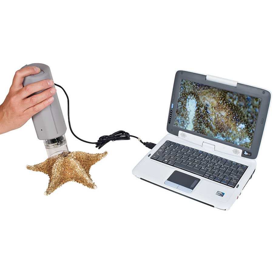 Микроскоп подключается к компьютеру через интерфейс USB, имеет всего 2 кнопки: кнопки включения нижней подсветки объектов, рассматриваемых «на просвет» и кнопки фото- и видеосъемки объекта. 3-х позиционный объектив позволяет выбрать увеличение: 20х; 40х или 100х. Съемная головка видеокамеры микроскопа позволяет рассматривать объекты в 3D формате.