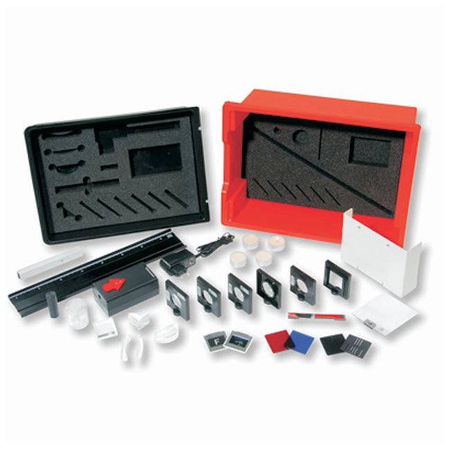 Набор оборудования для проведения 38 учебных опытов по лучевой оптике. Поставляется в прочной пластмассовой коробке с пенопластовыми вкладышами, выполненными по форме элементов оборудования, и с прозрачной крышкой. В комплект поставки входит компакт-диск, содержащий указания по подготовке и проведению опытов. Установки для опытов спроектированы таким образом, чтобы они не занимали много места, но оставались наглядными при их подготовке и проведении на основании для комплекта для учебных опытов или на поставляемой оптической скамье. В обоих случаях оптические элементы крепятся без скольжения с помощью магнитов. Входящие в комплект поставки накладки указывают места, где следует расположить элементы.