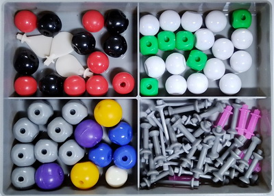 В комплект для составления объемных моделей молекул входят  пластмассовые шары разного цвета. На них имеются отверстия для соединительных стержней. Отверстия на моделях атомов расположены таким образом, что при сборке моделей молекул соблюдаются углы между химическими связями. В приведенной таблице указано, какими шарами обозначен тот или иной химический элемент в комплекте (также для составления различных моделей молекул можно добавлять необходимые отверстия для дополнительных соединений):