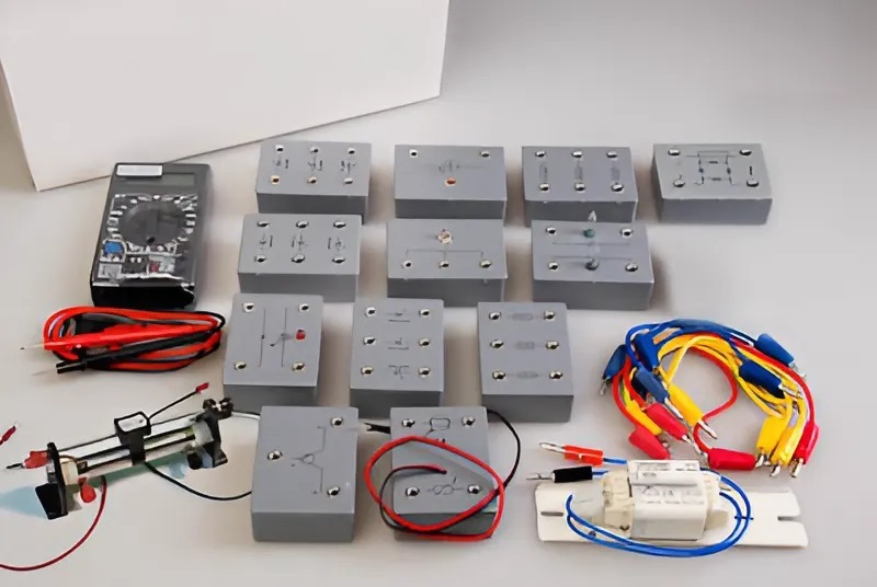 Для удобства сборки электрических цепей все элементы вмонтированы в пластиковые модули (по одному, два или три элемента в одном модуле) с клеммами под провода. Дно модуля с переменным резистором выполнено из прозрачного пластика.