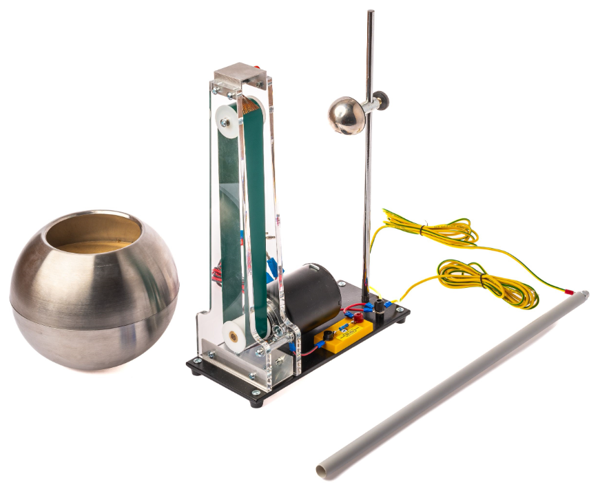 Набор позволяет познакомиться с переносом зарядов и созданием высокого напряжения в опытах по электростатике, которые иллюстрирует генератор Ван-де-Граафа.