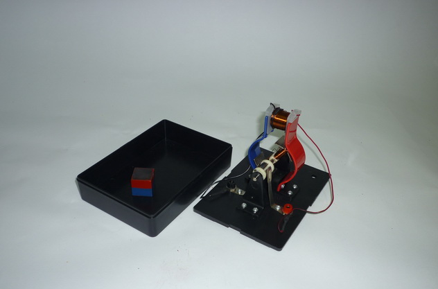 Прибор установлен на пластмассовом основании. Состоит их щеток с зажимами, обойм для постоянных магнитов якоря и центровочных винтов, служащих для его закрепления на оси. Якорь (двухлопастной электромагнит) закреплен на оси с пластинами коллектора. Модель предназначена для изучения устройства и действия электродвигателя постоянного тока при проведении лабораторных работ по физике в средней общеобразовательной школе. Позволяет собрать и испытать простейший электродвигатель, изучить зависимость магнитной индукции от силы тока, движение проводника с током в магнитном поле. Напряжение питания модели составляет 4 - 6 В.