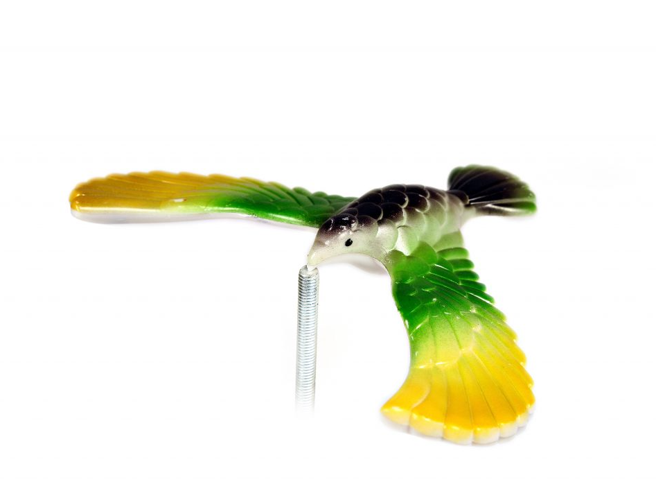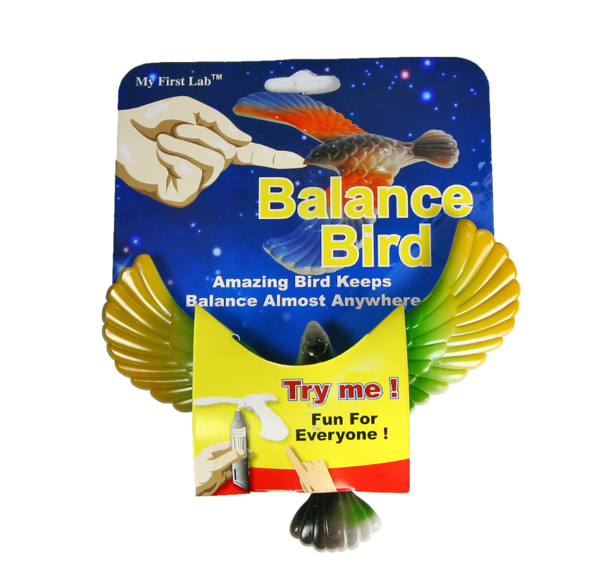 Пластмассовая фигурка птицы сбалансирована так, что удерживает равновесие держась только клювом за какую-либо поверхность (палец, карандаш или др.) Такая игрушка очень точна дает пояснение такому явлению, как баланс.