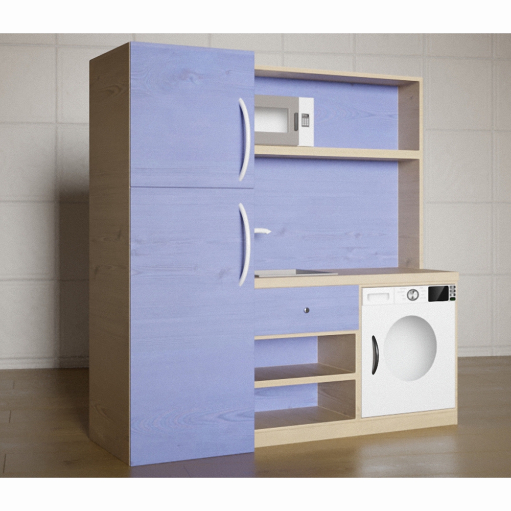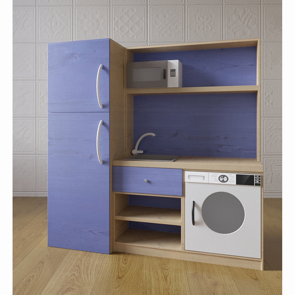 Фасад кухонного модуля «Василиса» окрашен в глубокий фиолетовый цвет, его выгодно оттеняет нейтральный бежевый на полках и по бокам. Кухонный модуль представленной модели имеет все необходимое для полноценной игры детей: СВЧ-печь, встроенная стиральная машина, мойка со смесителем, закрытые и открытые полочки для хранения. Модуль имеет компактные размеры и легко поместится в любой игровой зоне.
