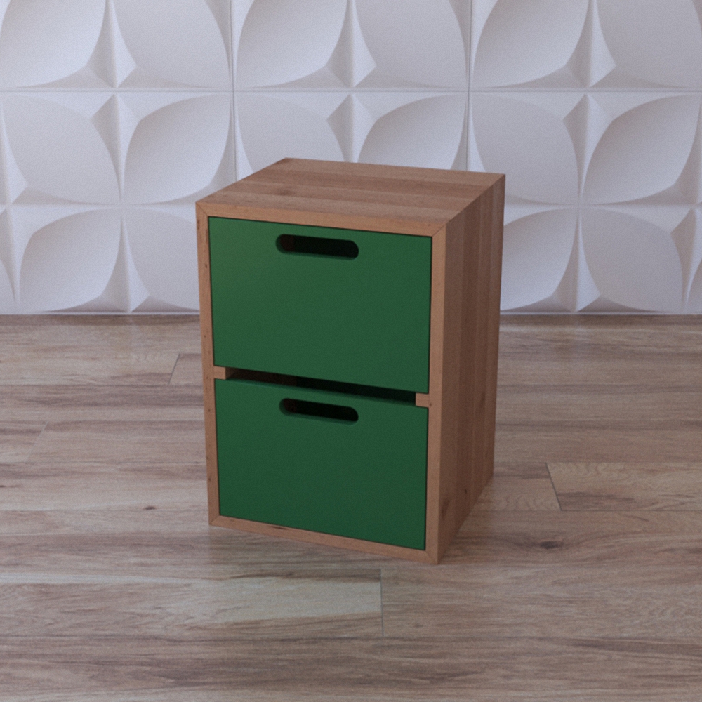 Игровой стеллаж-тумбочка является компактным дополнительным приспособлением для хранения учебных пособий или игрового материала. Предназначен дл оборудования системы хранения в группах детских садиков, коррекционных и реабилитационных центрах, классов в школах и т.д. Игровой стеллаж-тумбочка имеет 2 ящичка, крышки которого тёмно-зелёного цвета; основание модуля имеет цвет натуральной древесины. Не имеет острых краёв и углов.