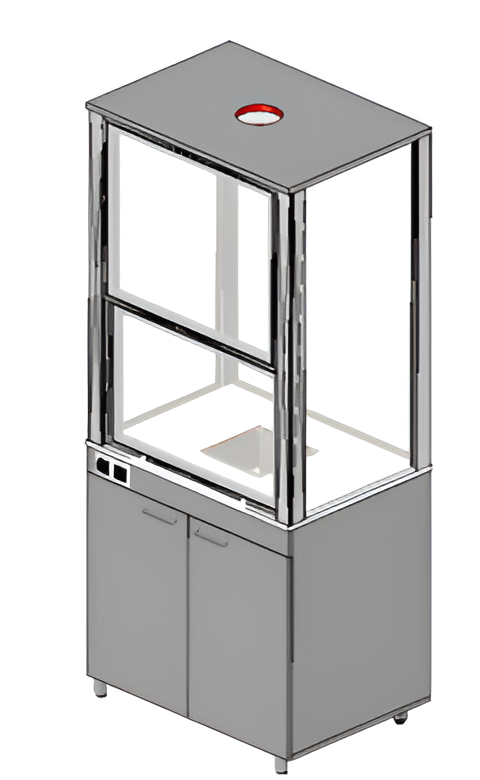 Передняя панель снабжена, электрическими розетками степени защиты IP 54. 2 распашные двери открывают доступ к сервисному отделению для обслуживания коммуникаций, которые расположены в рабочем отделении шкафа. В верхней части хим.стойкая столешница, в которую установлена мойка и смеситель.