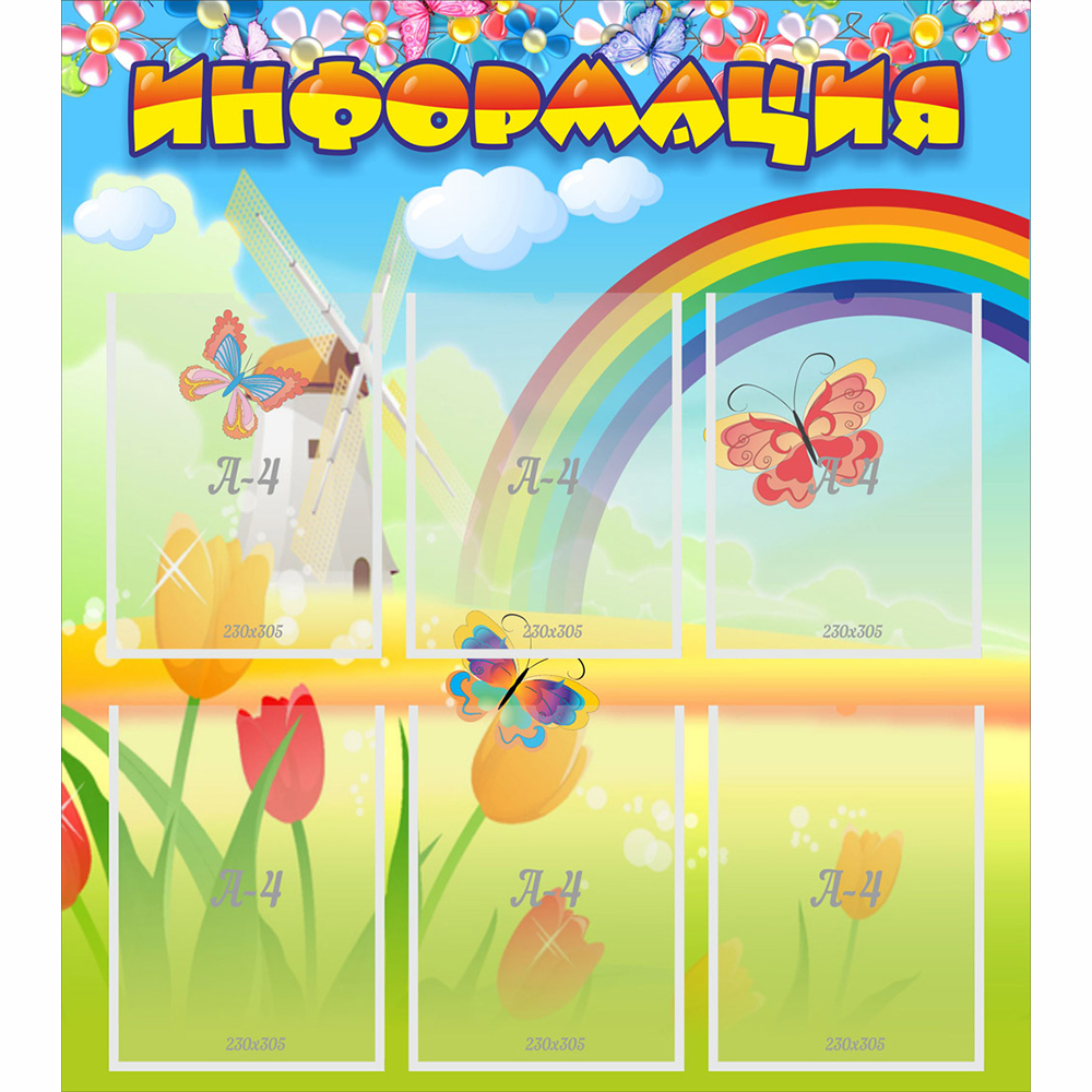 Для данного информационного стенда дизайнерами в качестве фона были выбраны луговые травы. Яркие цветы понравятся всем без исключения. В небе летают разноцветные бабочки.