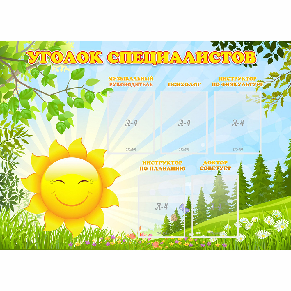Яркое улыбающееся солнышко заливает своими лучами цветущую лужайку на опушке леса. На таком издалека заметном фоне стенд "Уголок специалистов" предлагает ознакомиться с информацией от специалистов: медицинского работника, психолога, музыкального руководителя и инструкторов по физической культуре и плаванию. Пять прозрачных карманов формата А5 позволят им разместить различные информационные листы, плакаты и советы, а также своевременно их обновлять.