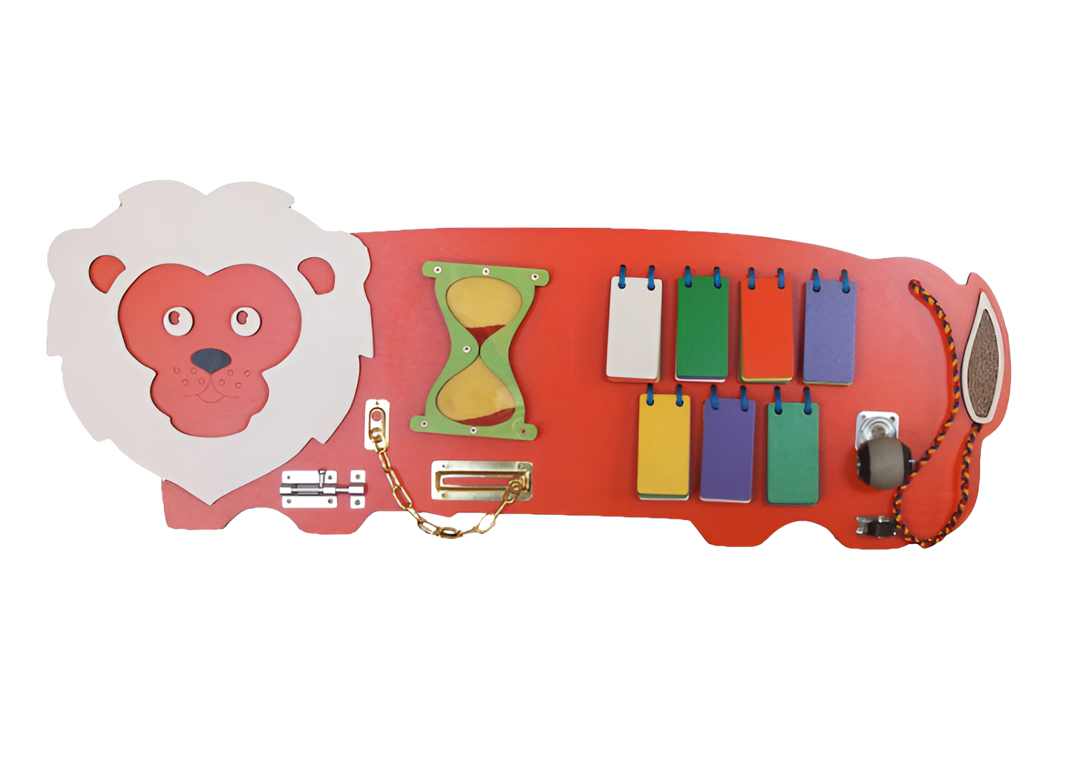 Бизиборд в виде льва – развивающая игра, которая улучшает моторику и формирует двигательные навыки. Точные и ловкие движение пальчиков малыша в дальнейшем будут отражаться на развитие речи. Яркие цвета улучшают воображение и фантазию.