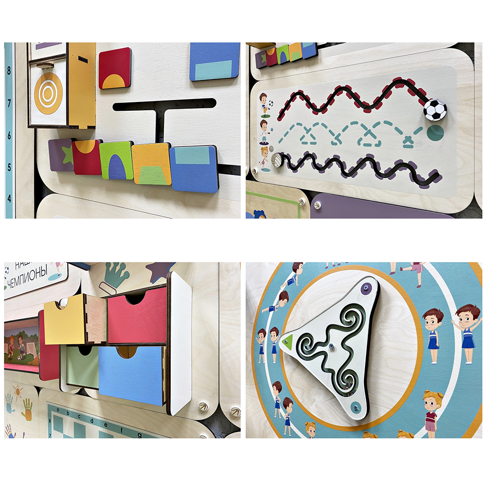 - Прочно закрепляются на стенах и не свалятся на детей, даже если они будут тянуть. Все материалы панелей безопасны для детей и сертифицированы. Малыши могут трогать, облизывать и грызть деревянные детали – их здоровью ничего не угрожает.