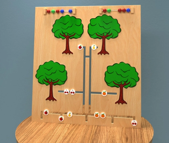 Перемещая разноцветные элементы внутри тактильного лабиринта по траектории снизу вверх, ребёнок может сортировать их по виду или распределять в произвольном порядке. Счёты познакомят малыша с основами порядкового и обратного счёта.