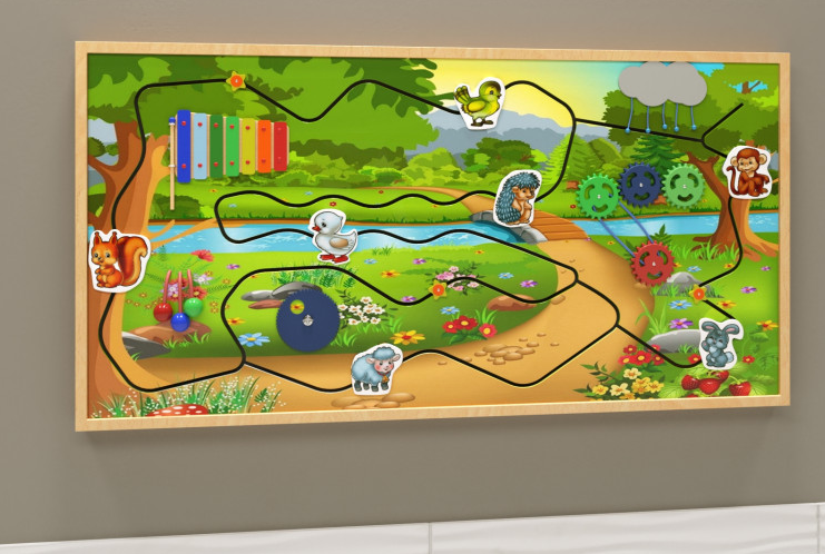 Настенная панель на тему среды обитания - яркий и красочный игровой модуль с дидактическим уклоном. На панели изображена лесная полянка и берег реки, река и кусочек полевой тропинки. По «ходам» лабиринта перемещаются разнообразные животные и птички. Также панель оснащена и некоторыми другими игровыми элементами.