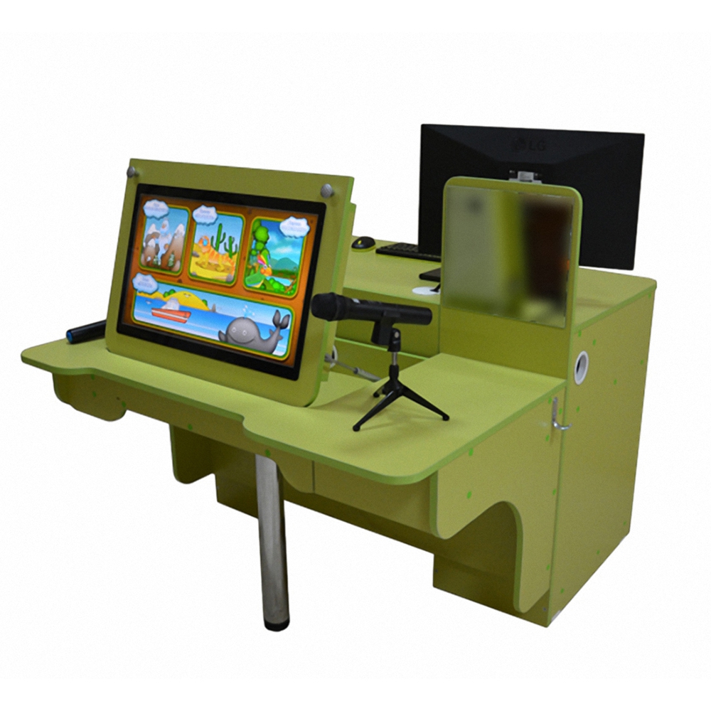 В комплектацию логопедического комплекса входит два стола: один служит для преподавателя, второй для ученика. Монитора тоже два. Для педагога – диагональю 22 дюйма, разрешением 1366х768 px. Для ребенка – встроенный сенсорный планшет размером 25 Дюймов, поддерживающий до 10 одновременных касаний. Также установлены 2 микрофона, клавиатура и мышь.