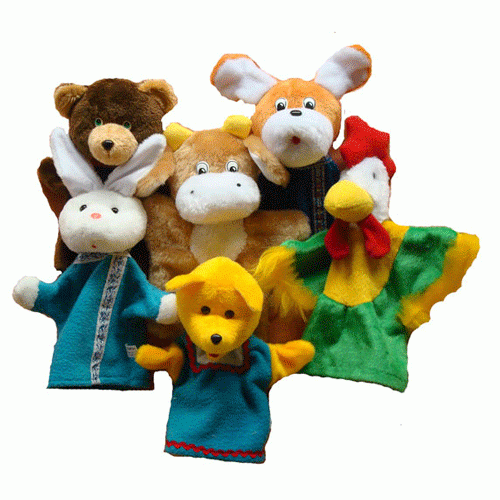 Набор состоит из 6 перчаточных кукол: Заяц, Лиса, Собака, Медведь, Бык, Петух.