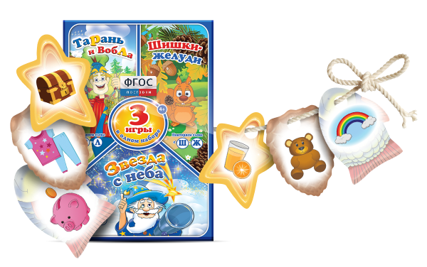 В игре три вида фигурных карточек: звездочки, рыбки и шишки. На каждой карточке нарисована картинка, в названии которой есть «трудный» звук: