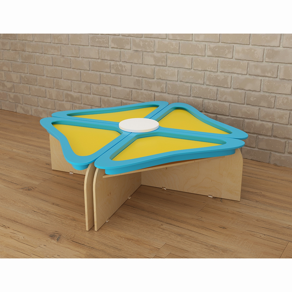 За счёт яркого дизайна и разнообразного наполнения этот детский игровой стол можно считать необходимым элементом оснащения пространства для занятий с детьми – ведь ребёнку гораздо приятнее заниматься и играть за таким необычным и красивым столом. Столешница выполнена в форме яркого небесно-голубого цветка, в каждой из 4-х частей имеются углубления (контрастного солнечно-жёлтого цвета), таким образом получается 4 отдельных игровых поля, на каждом из которых одновременно могут располагаться совершенно разные игры. Для чего нужно: Детские игровые столы широко используются для групповых и индивидуальных занятий с детьми дошкольного и младшего школьного возраста в детских садах и центрах раннего развития. Игровой стол “Василёк” подойдёт для занятий с небольшой группой детей, до 4-х человек.