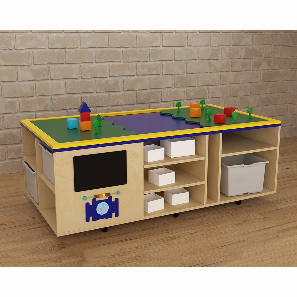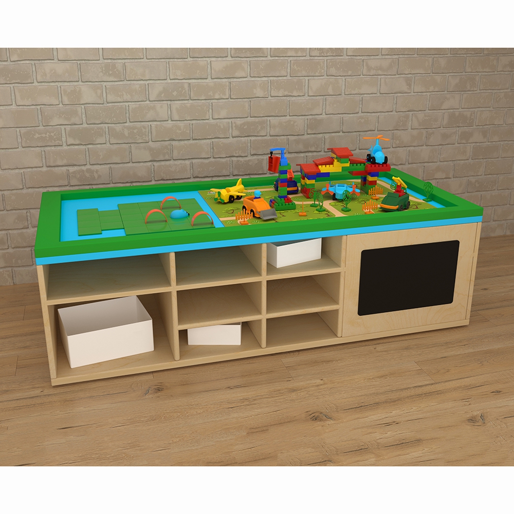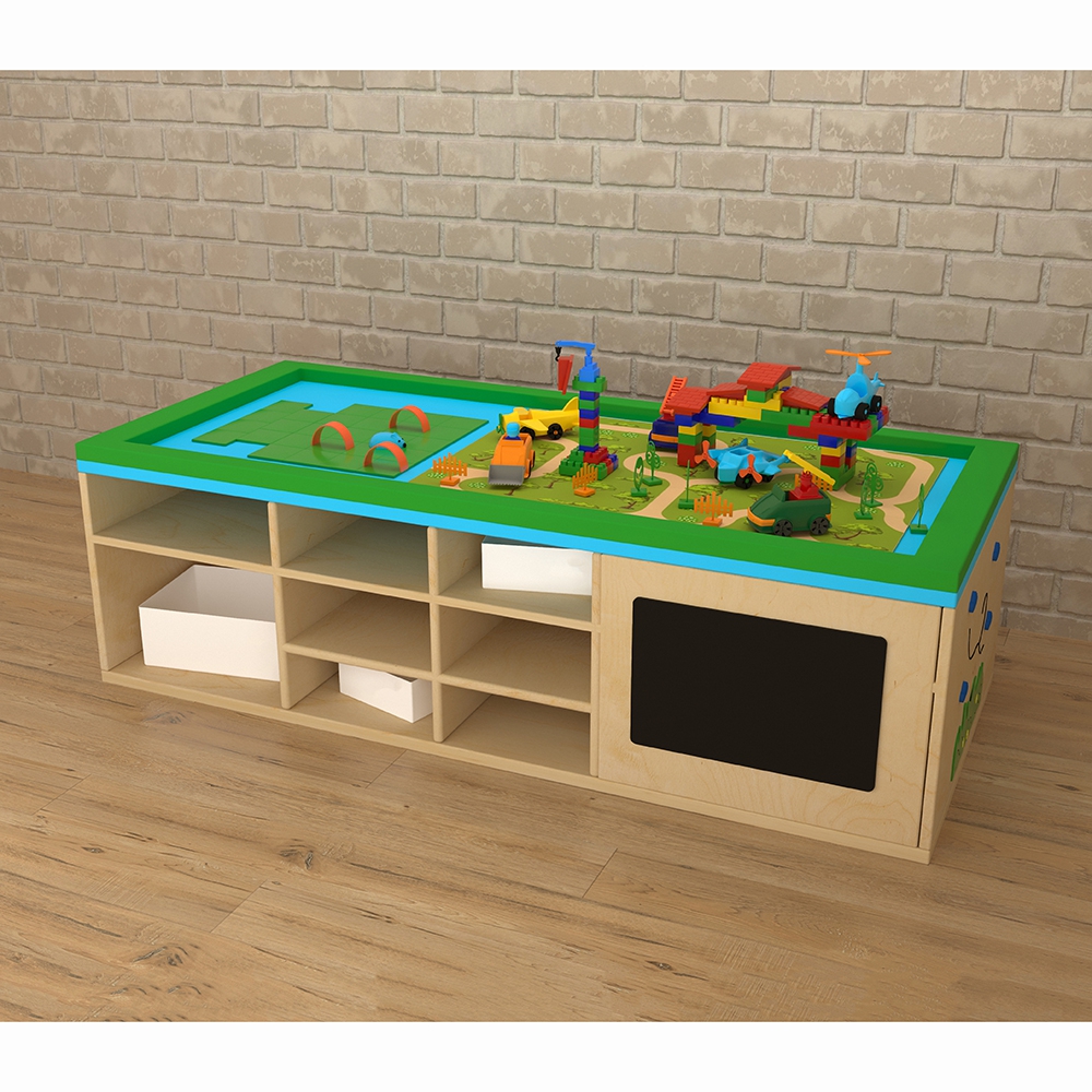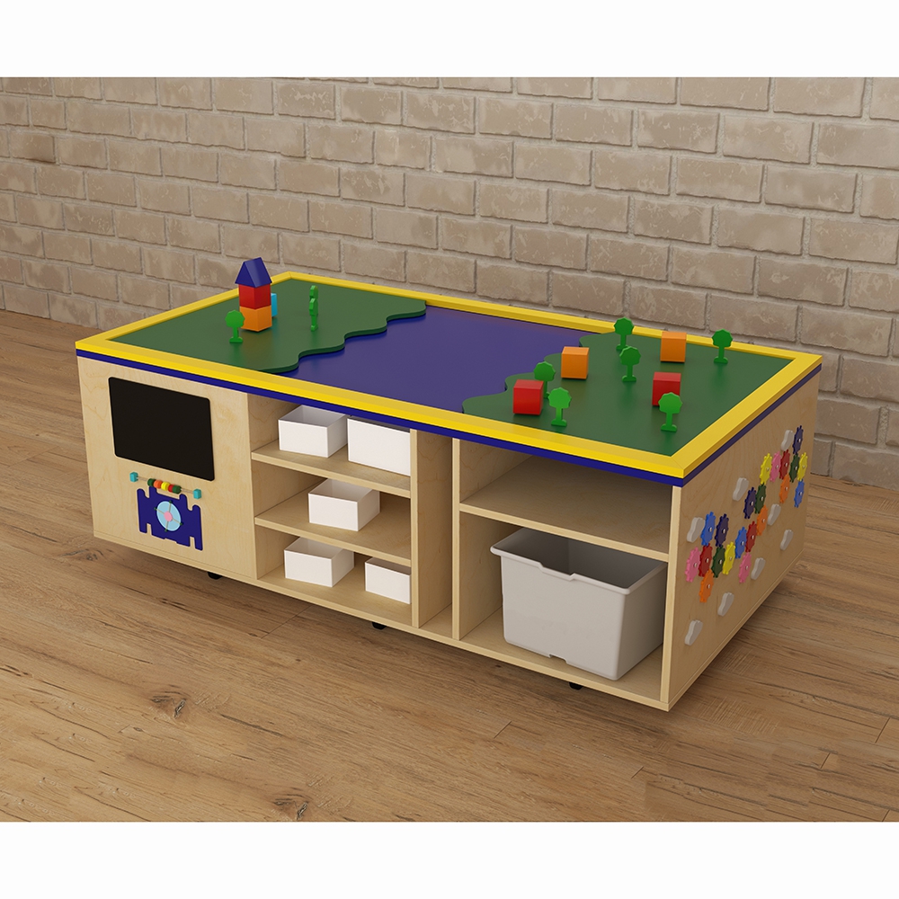 STEAM-стол очень удобен для групповых и индивидуальных развивающих занятий с детьми. На боковых сторонах стола имеются приспособления для развития мелкой моторики – шестерёнки, счёты, меловая доска и т.д. Расположенные на поверхности стола локации помогут формированию у детей картины мира и отдельных его составляющих. В ячейках стола расположены боксы, наполнение каждого – это отдельная развивающая игра, предназначенная для развития разнообразных навыков у детей.