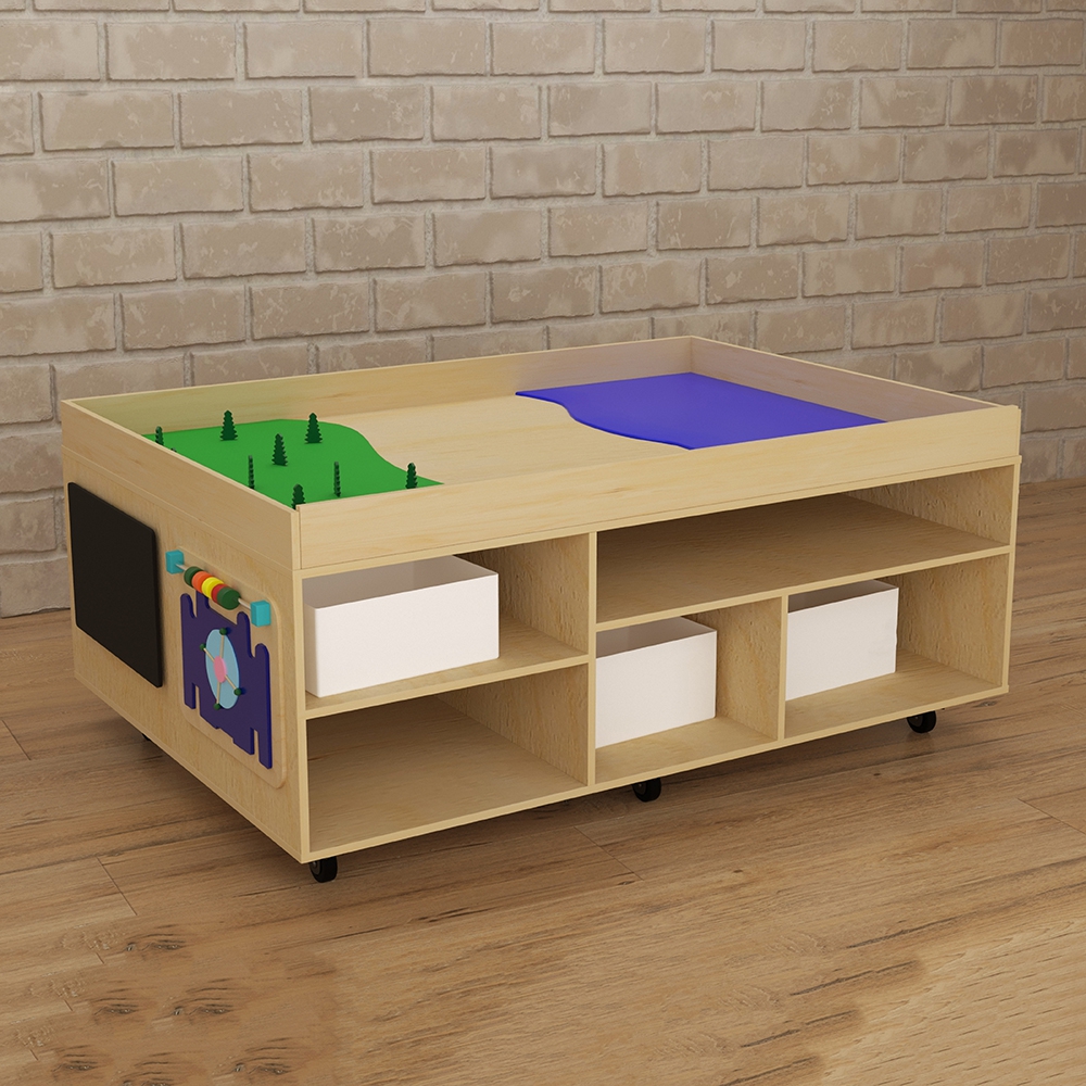 STEAM-стол “Море, суша и лес” – многофункциональный развивающий детский игровой модуль. Главное его преимущество – рациональное использование имеющихся площадей – на столешнице расположена ландшафтная локация, а на боках стола – развивающие элементы и полки-ячейки; это делает его необходимым элементом оснащения пространства для занятий с детьми. Стол имеет колёсики – это позволяет без труда перемещать его сколько угодно раз по помещению, не задействуя большео количество силы и не повреждая напольное покрытие. STEAM столы широко используются дошкольными педагогами и некоторыми узкими детскими специалистами – логопед, дефектолог, психолог – для групповых и индивидуальных занятий с детьми дошкольного и младшего школьного возраста.
