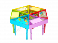 6 треугольных  разноцветных приставных столика — трансформера. Столы имеют световой планшет для рисования песком, а так же, три отсека: Для песка, формочек и игрушек. Материал ЛДСП. Подсветка световых планшетов - 16 цветов 3 режима. Ножки телескопические c регулировкой высоты.