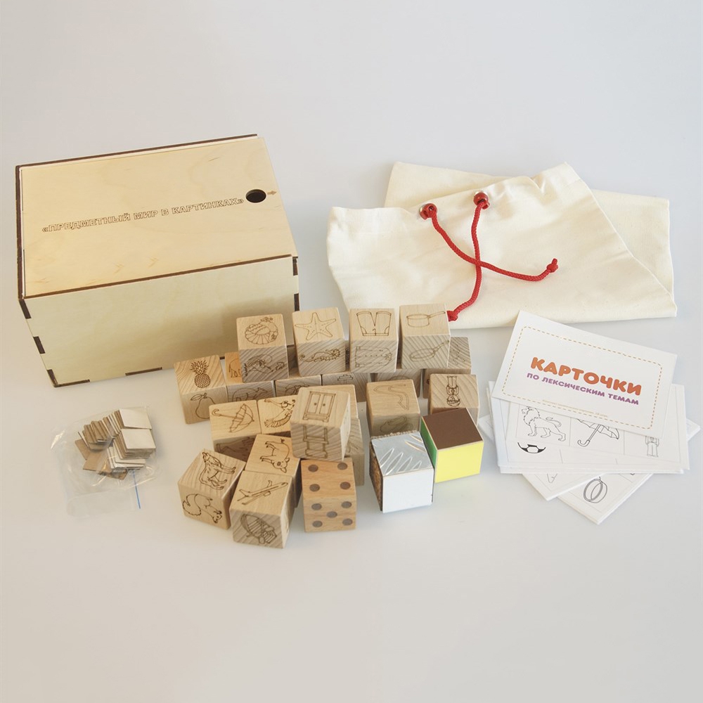 Набор «Предметный мир в картинках» полезен для психомоторного развития детей дошкольного и младшего школьного возраста. Иллюстрированные кубики используются в диагностике интеллектуального, речевого, сенсомоторного развития, в процессе изучения особенностей конструктивного праксиса ребенка.