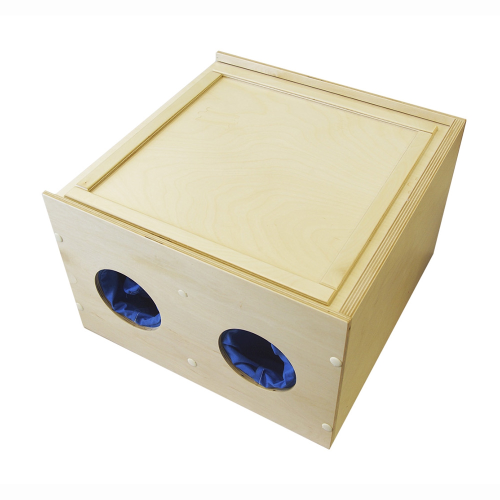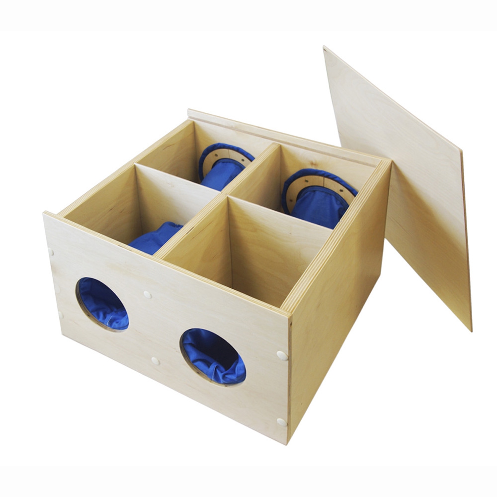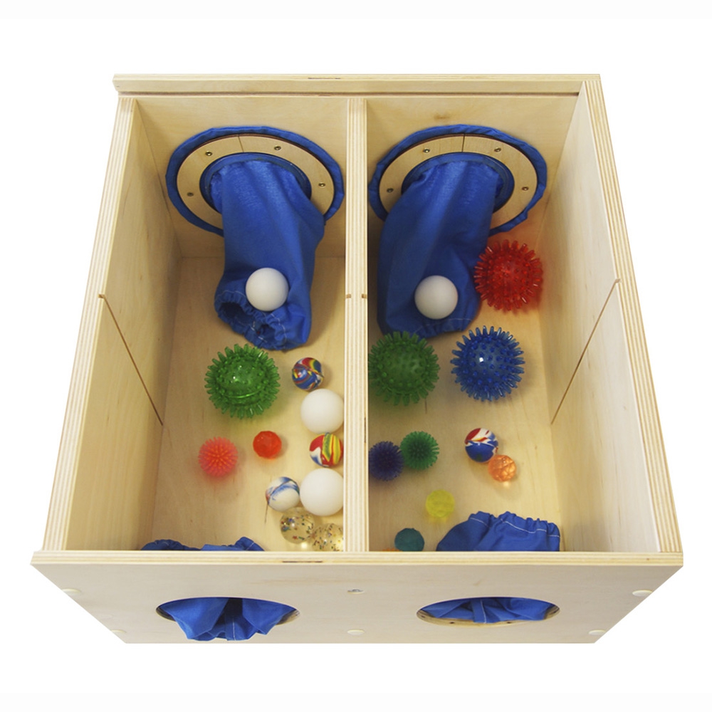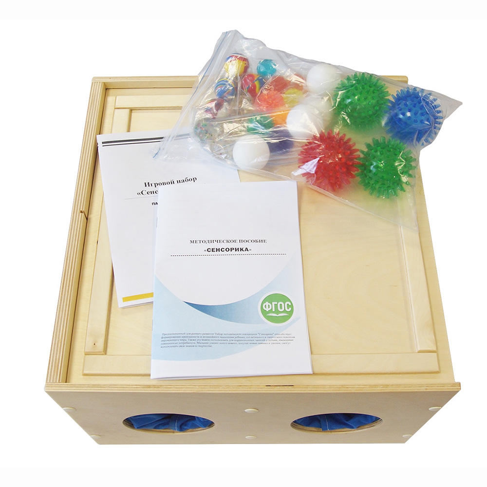 Сенсорный ящик представляет собой коробку, со сдвижной крышкой, на противоположных торцах имеются по 2 круглых отверстия, которые снабжены тканевыми рукавами. Внутри ящик имеет съемные перегородки, которые можно устанавливать или вынимать в зависимости от учебного процесса. Все края обработаны и травмобезопасны. В комплекте имеются методические руководства, набор тактильных шариков разной фактуры и размеров в количестве 24 шт.