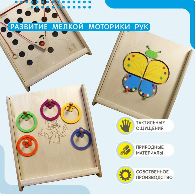 Все игры направлены на комплексное физиологическое развитие ребенка. Тактильное восприятие от прикосновения к поверхностям делают игру интересной, приятной и успокаивающей. Сенсорное восприятие - это первый инструмент, через который дети познают мир вокруг себя. На наших руках находится множество рецепторов, которые передают информацию в головной мозг. Через тактильную среду происходит изучение мира и окружающего пространства. Активное движение пальцев стимулирует зоны коры головного мозга, которые отвечают за моторику и за речь. У детей память и процесс мышления происходят практически одновременно. Это территория вашего ребёнка, на которой он может спокойно крутить и трогать предметы. Отодвигая пальцами рук замочек из стороны в сторону, малыш открывает и закрывает окошки, это очень увлекательный процесс для детей.