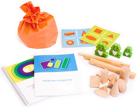 Набор деревянных геометрических объёмных и плоских фигур, набор деревянных фигур по лексическим темам (фрукты, овощи, животные, игрушки), 12 карточек и фишки, 3 деревянные пластины, 3 деревянные палочки, набор лент разной ширины и длины, набор детской посуды из трёх предметов, мешочек, фирменная сумка, методическое пособие «Коррекционно-педагогическая работа по сенсорному развитию детей дошкольного возраста», методическое руководство