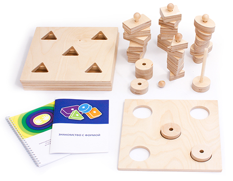Игровой набор предназначен для формирования представлений детей о геометрических фигурах (узнавание, сличение, знание названий, самостоятельное называние). Набор создан на основе классического пособия «Рамки и вкладки», но с внесением существенных конструктивных изменений эргономических показателей, что обеспечивает удобство выполнения предлагаемых заданий (захват, удержание, нанизывание и пр.).
