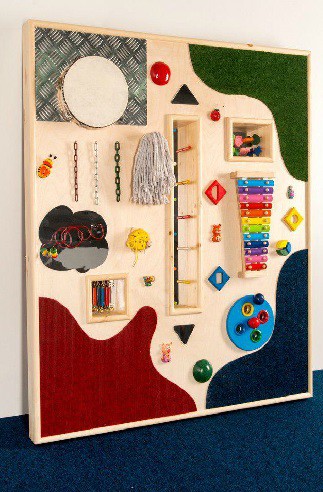 Панель сочетает в себе функции тактильной, зрительной,звуковой стимуляции, развития мелкой моторики и игровой терапии. Разнообразное наполнение сделает эту панель одним из главных элементов и сенсорной, и детской игровой комнаты. Размеры панели позволяют одновременно играть с ней нескольким детям.