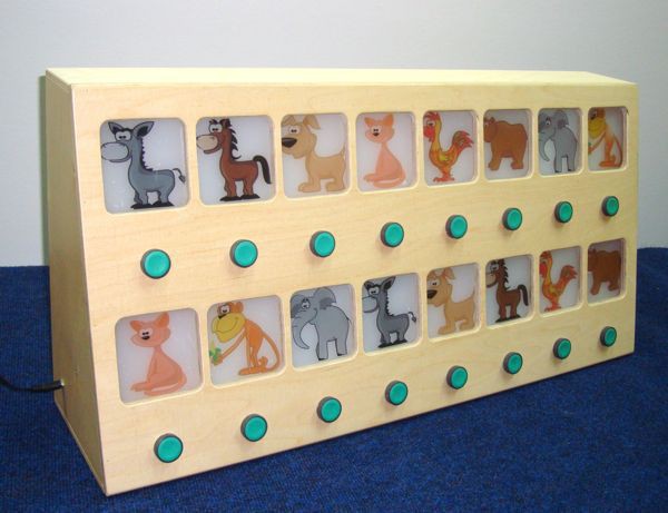 Над кнопками находятся изображения слона, собаки, осла, петуха, обезьяны, лошади, кошки и медведя. Нажав на кнопку из верхнего ряда животных, изображение начинает светиться.  Для того, чтобы прозвучал звук данного животного, необходимо в нижнем ряду найти такое же изображение и нажать на кнопку под ним. Если животные выбраны неправильно, то подсветка изображения погаснет, и звук животного воспроизведен не будет.