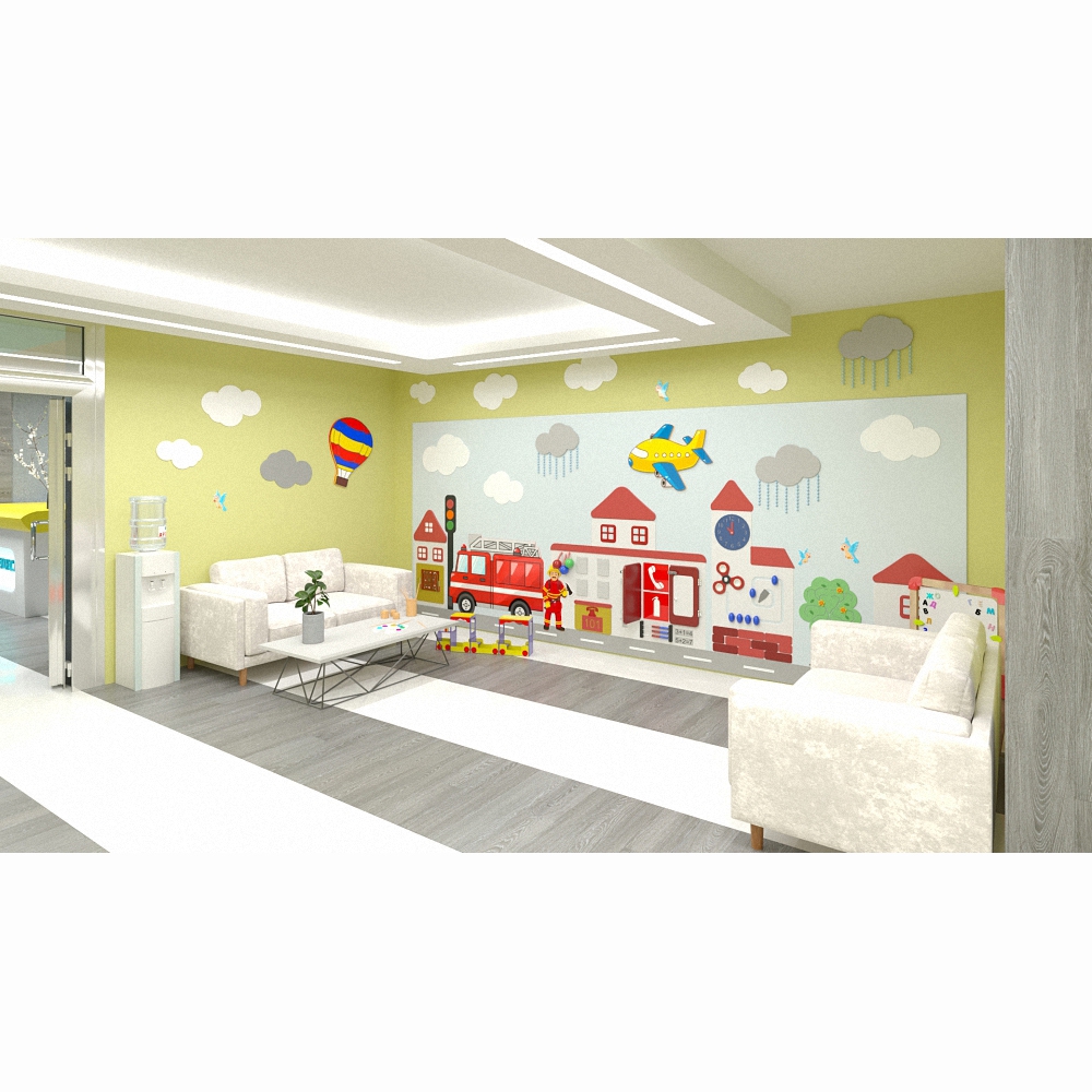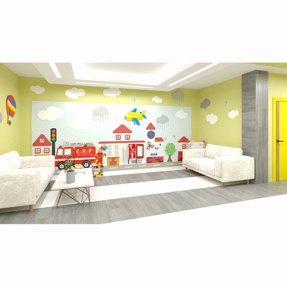 Настенная панель «Служба спасения» не нуждается в дополнениях и может выступать как самостоятельное оснащение игровой зоны в общественном учреждении (медицинской клинике, банке, кафе, частной компании) благодаря масштабным размерам и обилию разнообразных функций.